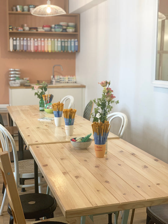 Céramicafé Paris 14: The entrance door is wheelchair accessible. The toilets and workshops with pottery wheels are located in the basement, accessible only by stairs. The ceramic painting workshops take place on the ground floor and in the basement: if you have difficulty going down the stairs, please let us know by email before the date of the workshop so that we can organize your table in the best place.