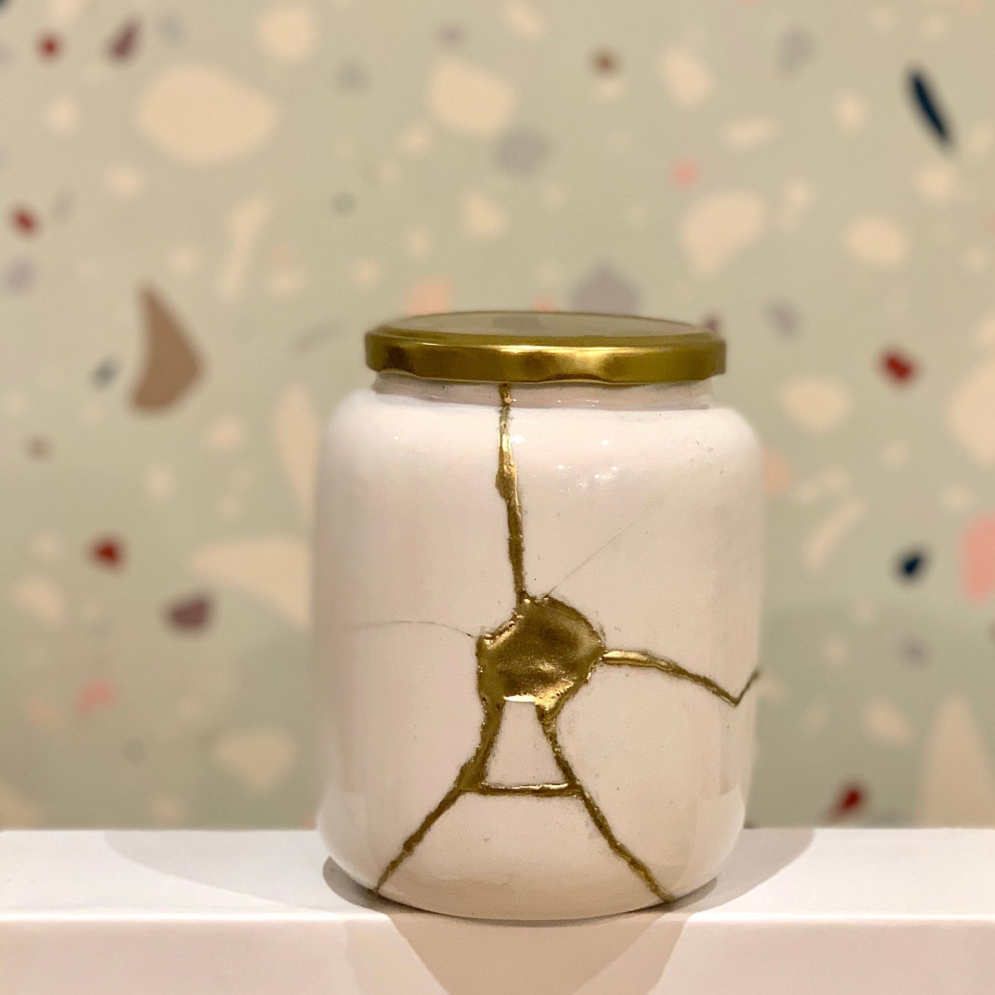 Kintsugi means: Kin, gold and tsugi, the joint: 金継ぎ, "gold joint". This is a Japanese technique of repairing broken ceramics with gold.